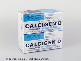 Calcigen D 600 mg/ 400 I.E. Kautabletten ist eine Kombination aus dem Mineralstoff Calciumcarbonat und dem Vitamin D. Calcigen D 600 mg/ 400 I.E. Kautabletten werden bei bestehendem Mangel an beiden Stoffen, sowie zur unterstützenden Therapie bei Osteoporose eingesetzt. Calcium ist der häufigste Mineralstoff im Körper. Er baut das Knochengerüst auf und ist Bestandteil von Knorpeln und Zähnen. Er ist an Muskelfunktionen, an der Übertragung von Nervensignalen und an der Blutgerinnung beteiligt und Vitamin D fördert die Aufnahme von Calcium in den Körper und dessen Freisetzung aus dem Knochengerüst.
