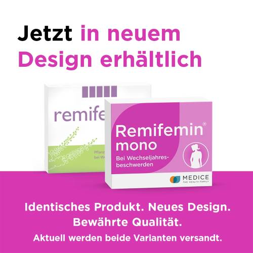 Zusätzlich gibt es vor allem für Frauen, die eine Einmalgabe ihres Wechseljahrespräparats bevorzugen, Remifemin mono . Die Tagesdosis von Remifemin mono entspricht der von Remifemin, ebenso Wirksamkeit und Verträglichkeit.